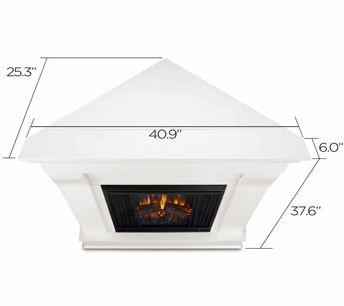 The Chateau 5950E-W Corner Electric Fireplace is finished in White and uses a new electric firebox that generates heat. Four stepped mantel with an elevated hearth which raises the firebox level for easy viewing around other furniture.