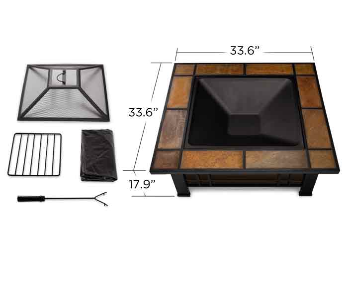 Burns seasoned firewood or converts to Real Flame gel fuel. Heat resistant powder coated steel frame with tile top. Basic assembly required.