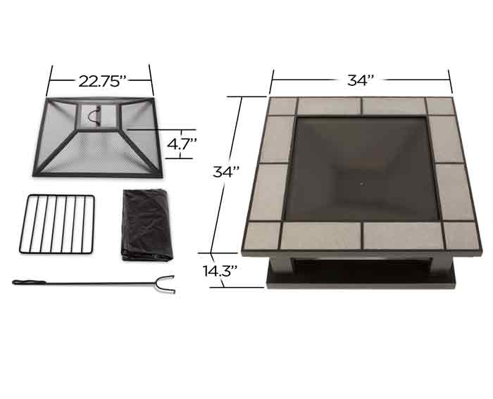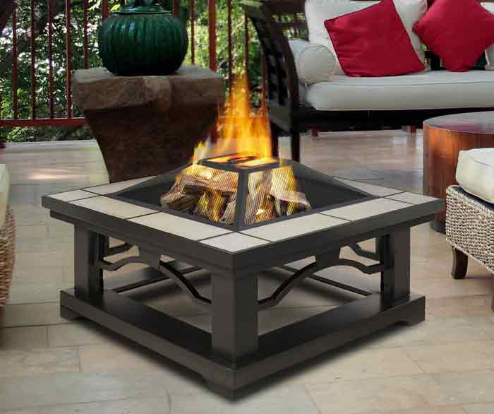 Burns seasoned firewood or converts to Real Flame gel fuel. Heat resistant powder coated steel frame with tile top. Basic assembly required.